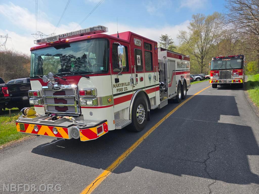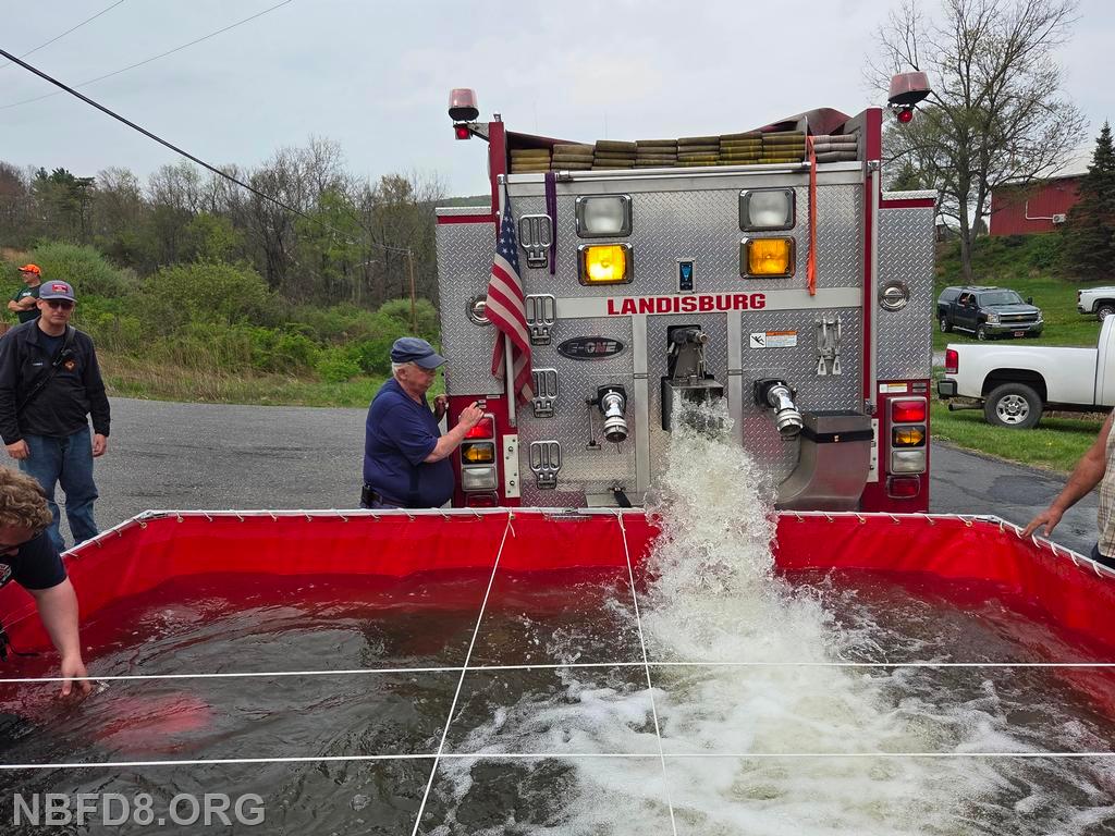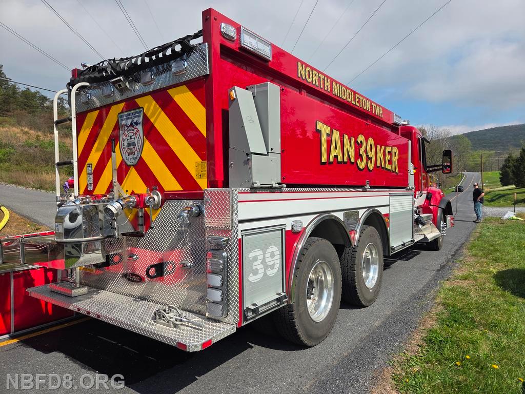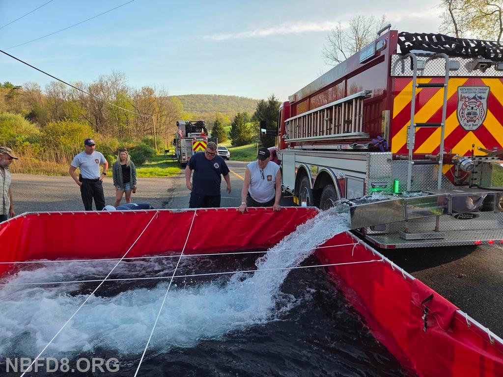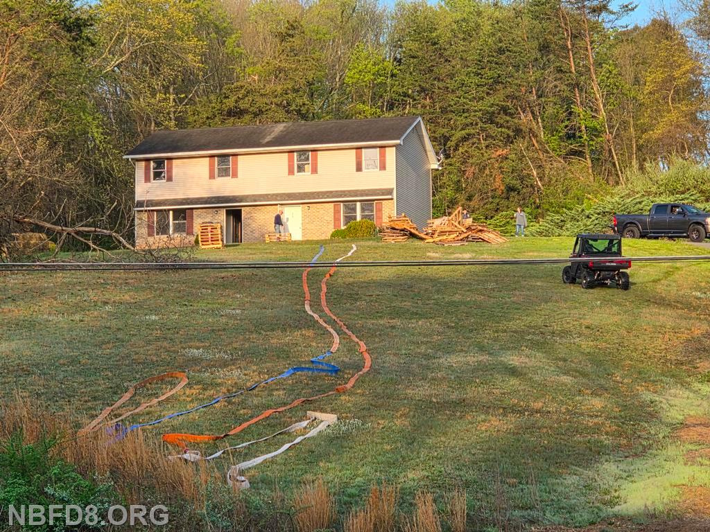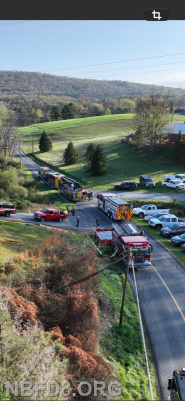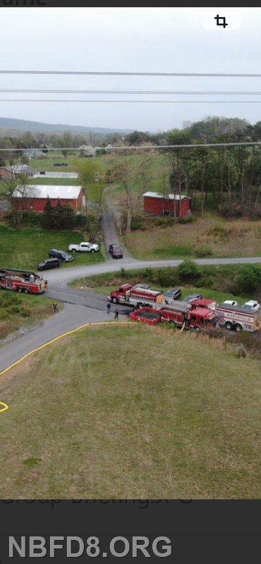 Engine 8 drafted from a fold-a-tank and pumped a 5 inch line to supply Engine 12 for fire attack during the burn. Tankers from 12, 6, 4, and CC 39 had the job of shuttling water, and an Engine from Blain (1-1) had a fill site established by a nearby creek for filling tankers. Also an air unit out of Carlisle Station 45 was on scene filling cylinders. Thanks to Company 12 for hosting and lunch. Drone Photo Credit: Charles Theiman and Chris Strolls