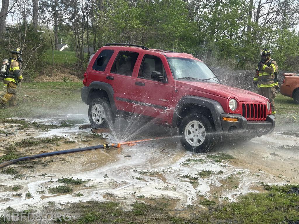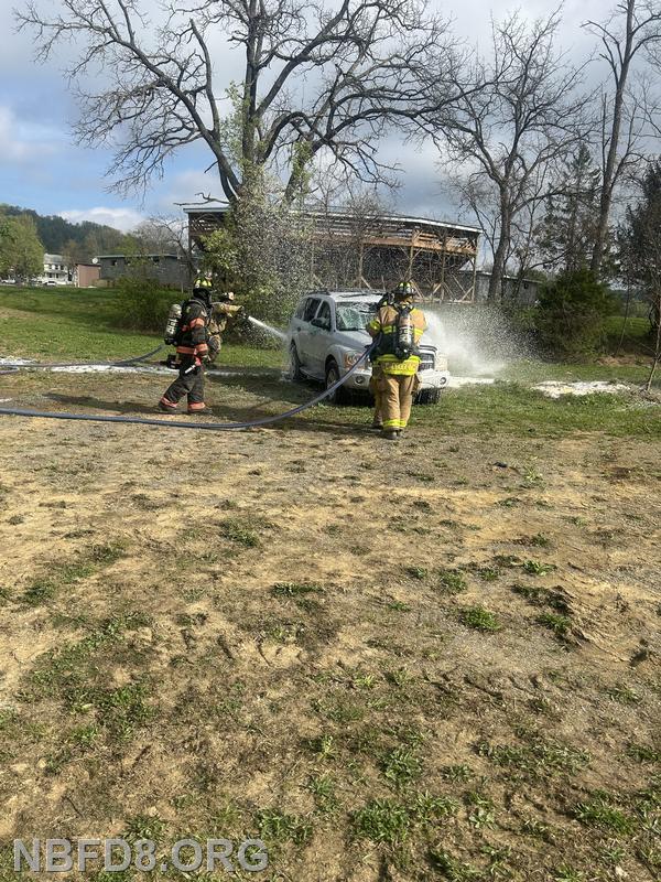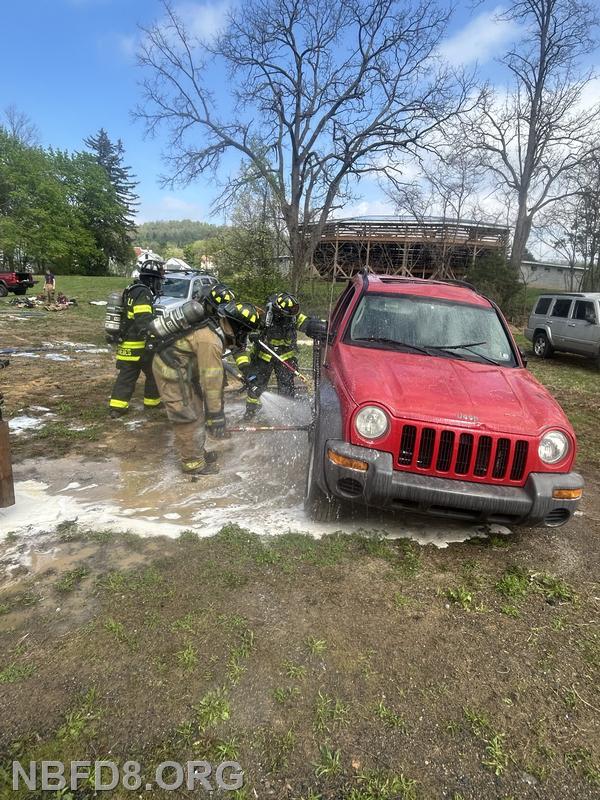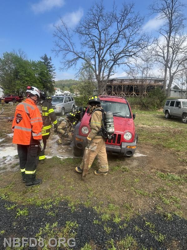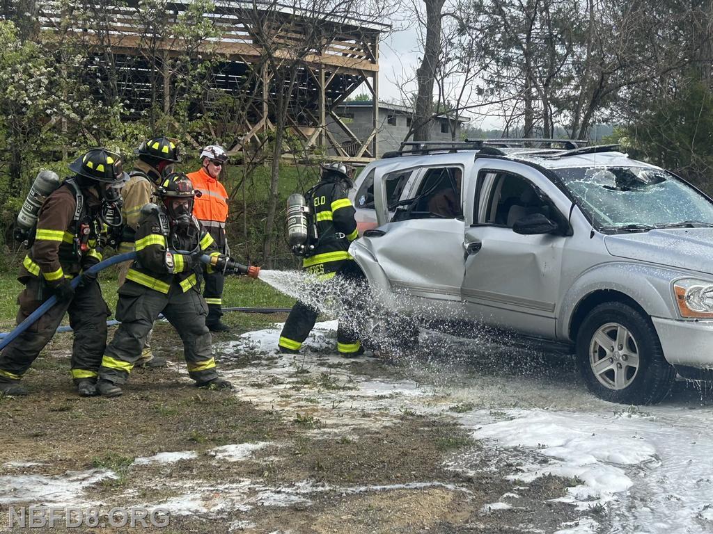 | On Saturday members from New Bloomfield and Ickesburg Fire Companies had a class involving electric vehicle fires at Station 8. Members had the opportunity to practice many techniques including an under body cooling nozzle, and a side vehicle lift to expose the batteries for hose line cooling. Also used our battery Amkus rescue tools with hose line protection to do an extrication with SCBA. Thanks to both companies and their members for coming to this training.