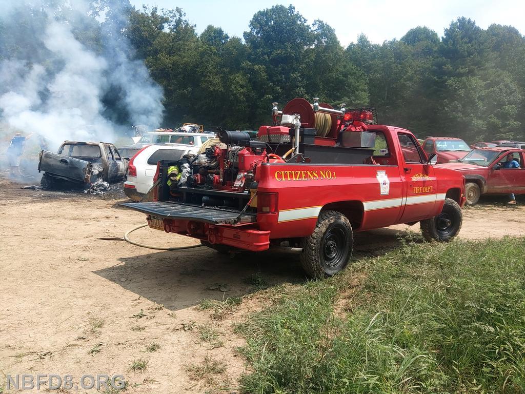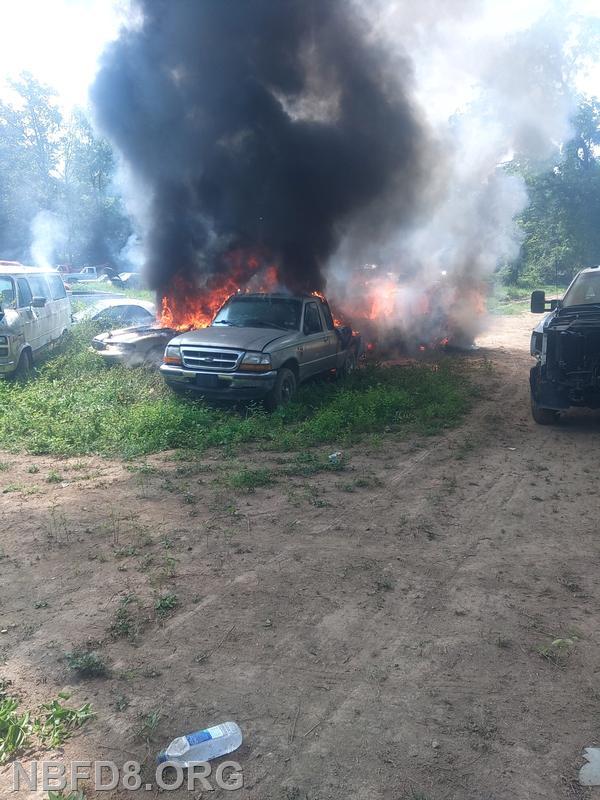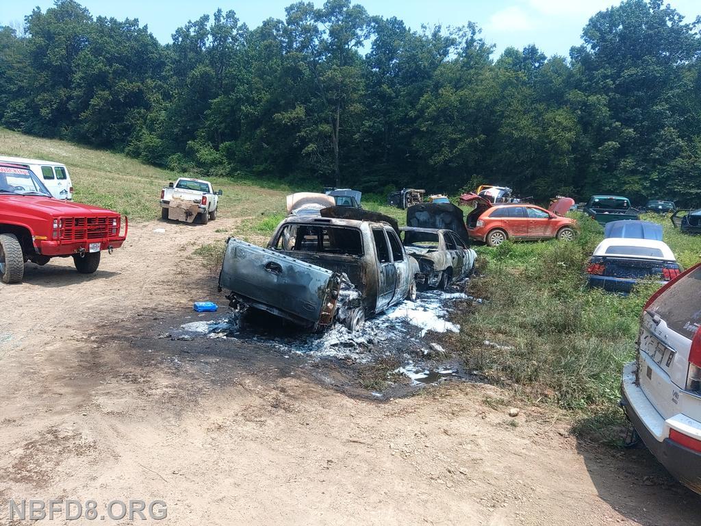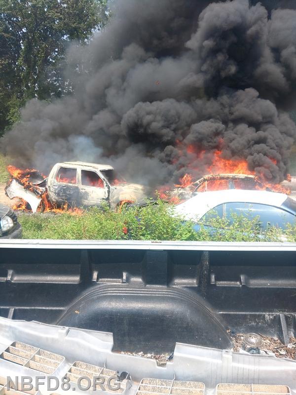 8-7-25 @ 11:27 Engine and Tanker 8 were dispatched for a vehicle fire at 3403 Cold Storage Rd, Centre Twp. As NBFD units were responding County advised units that this vehicle will be in a field. NBFD units arrived to find 3 vehicles on fire in a remote junk yard, and had to access this by off road with Brush 8. Chief 8 requested 2 additional brush units bringing in brush 10 and 3. Tanker 8 filled all brush units multiple times to extinguish this fire. Engine, Tanker and Brush 8 out with 10 members
